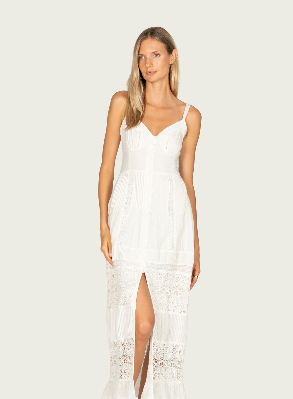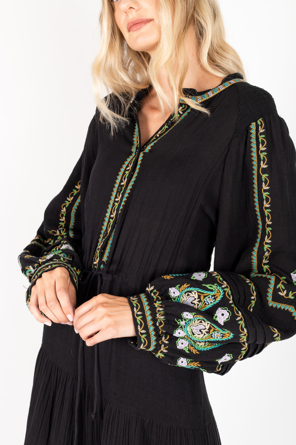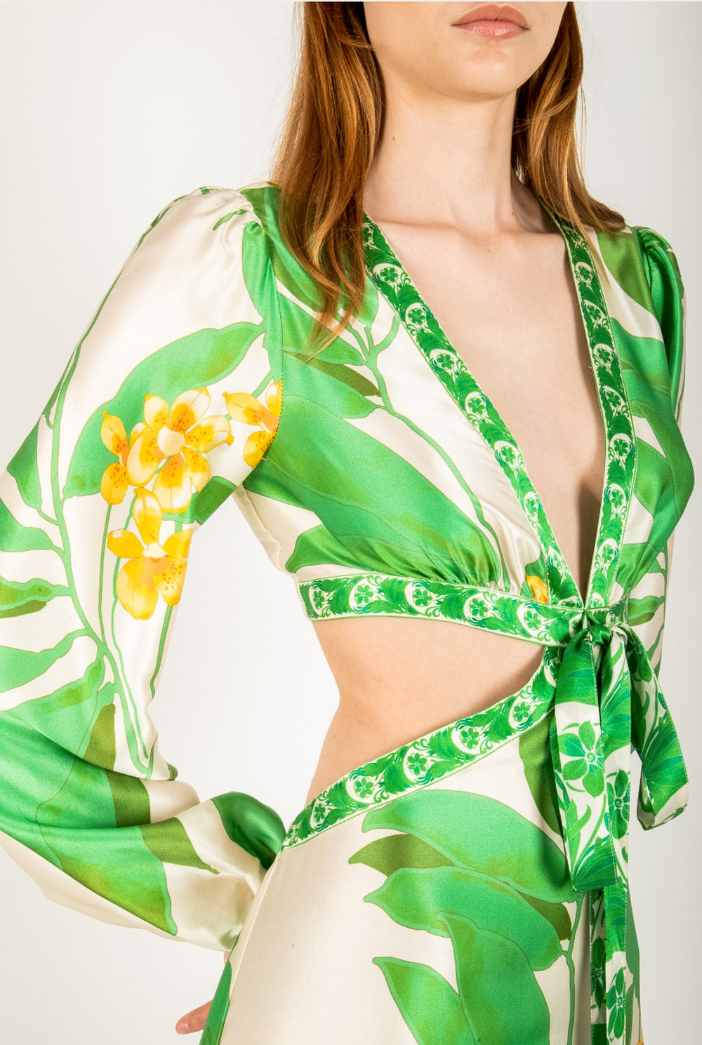 Effortlessly chic in the Alyssa Dress. This must-have mini is a new favorite designed from a lurex silk chiffon fabric printed with whimsical green ditsy garden flower. It has ruched gathers with floral appliqués and effortless cascades of ruffles.