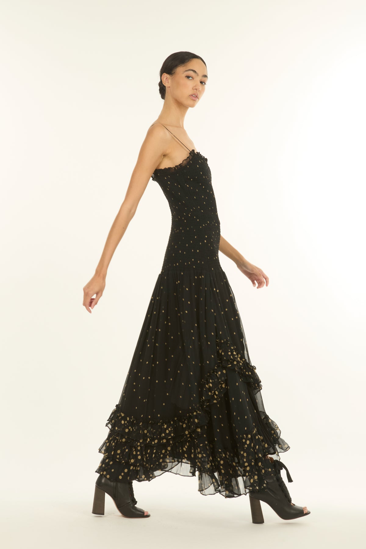 Secret Mission’s Bianca Maxi Dress is crafted from 100% silk chiffon in the signature mixed polka dot print. Designed with a smocked bodice and slim adjustable straps, it fits closely through the bust while falling into a flowing, vintage-inspired skirt with ruffled detailing. This maxi dress combines elegance with ease, offering graceful movement and a romantic silhouette.
